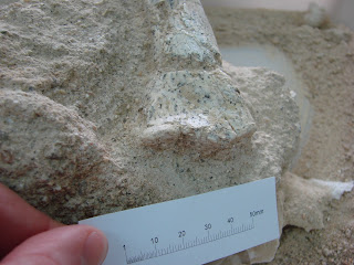 El día de trabajo deparó sorpresas ya que el segundo paquete asignado que aparentemente prometía contener un resto fósil indeterminado, en realidad no era más que un enorme terrón de sedimento arenoso y no contenía nada salvo una pequeña esquirla de hueso indeterminado y lo que a todas luces parecía ser el resto fósil, descubrí para mi decepción, que era una impresión a modo de molde del molar decidual del primer paquete asignado, que imagino que se extrajeron juntos en el yacimiento.